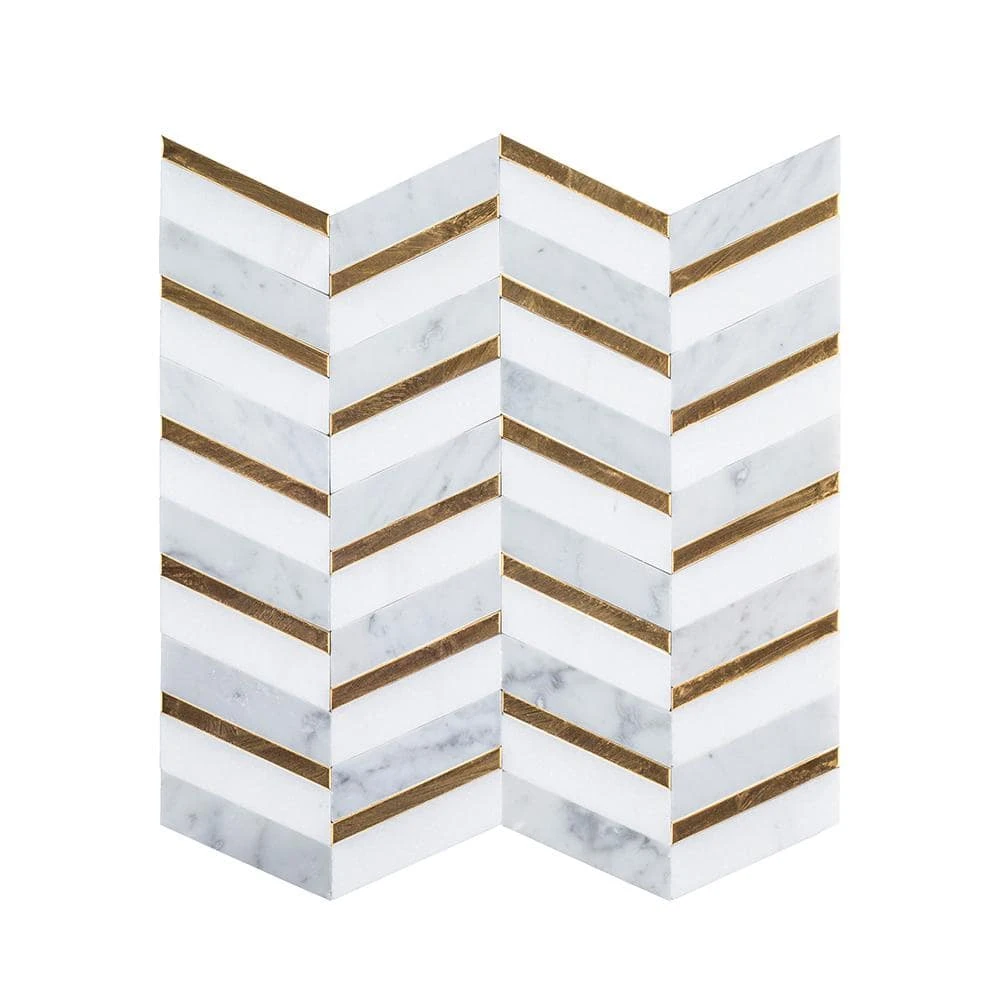 Make your bathroom, kitchen or accent wall stand out with the Dreamcicle Gray 11-3/4 in. x 12-3/4 in. Natural Stone Mosaic Tile. Chevron pattern mosaic features golden brass metal trim pieces along with carrara gray veined and white thassos marble alternating throughout the mosaic to create an impactful visual. Recommended for backsplashes, bathrooms, kitchens, floors, and accent walls. Combine with other mosaics and field tiles to create impressive installations. For best installation results, use white polymer-modified thinset.