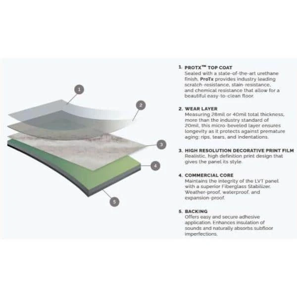 - Thanks to the uniquely formulated ProTX protective layer, our LVT is impenetrable by liquids, scratch- resistant, and simple to clean. No more fear of spills that stain or ruin floors