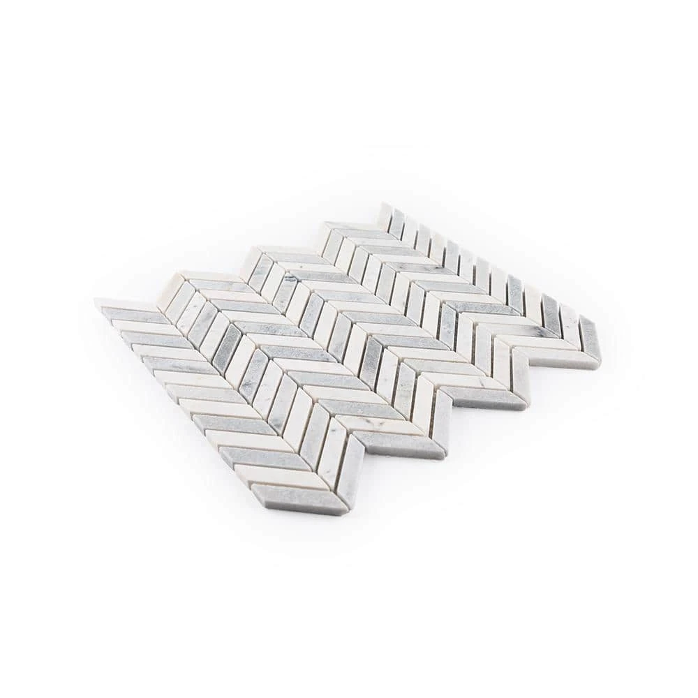 Add a classic yet contemporary look to your space with the Jetwing Mosaic. This natural stone mosaic features elegant white and grey marbles alternating in a traditional chevron pattern. Each marble provides a unique veining with a brilliant polished finish that gives the V-shaped pattern an added layer of character. Combine with other mosaics and field tiles to create impressive installations. For best installation results, use white polymer-modified thinset. Screen reader support enabled.