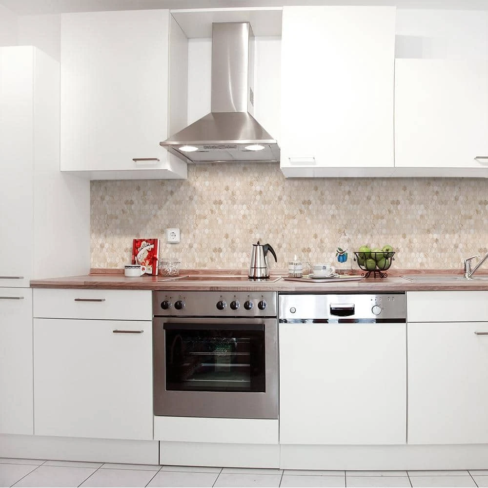 Travertine Constellation 10-7/8 in. x 11-5/8 in. Travertice Mosaic Tile is perfect for adding rustic charm to your home. This honed finish honeycomb mosaic is made up of mini hexagons in a tan color. Punctuated with natural textured surface imperfections for a worn, rustic look. Combine with other mosaics and field tiles to create impressive installations. For best installation results, use white polymer-modified thinset.